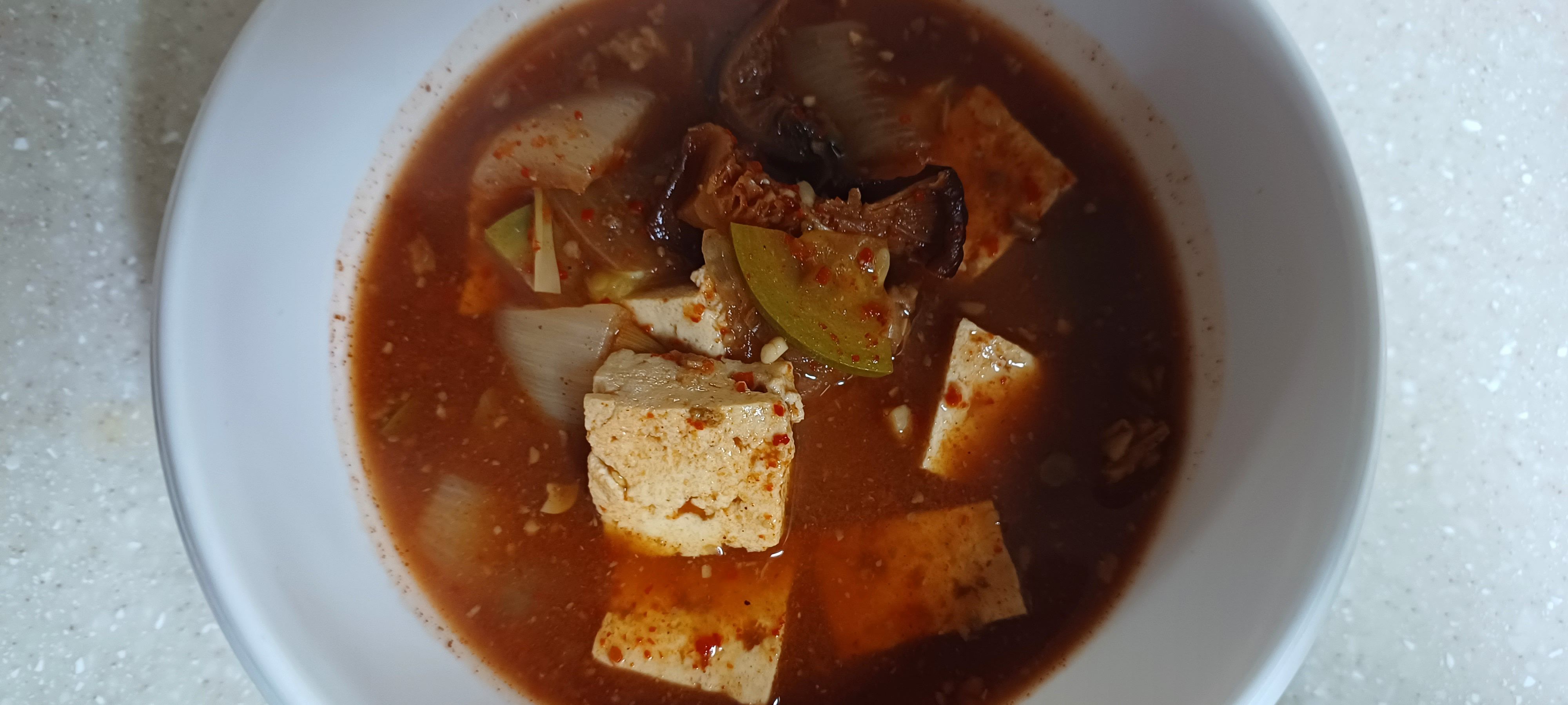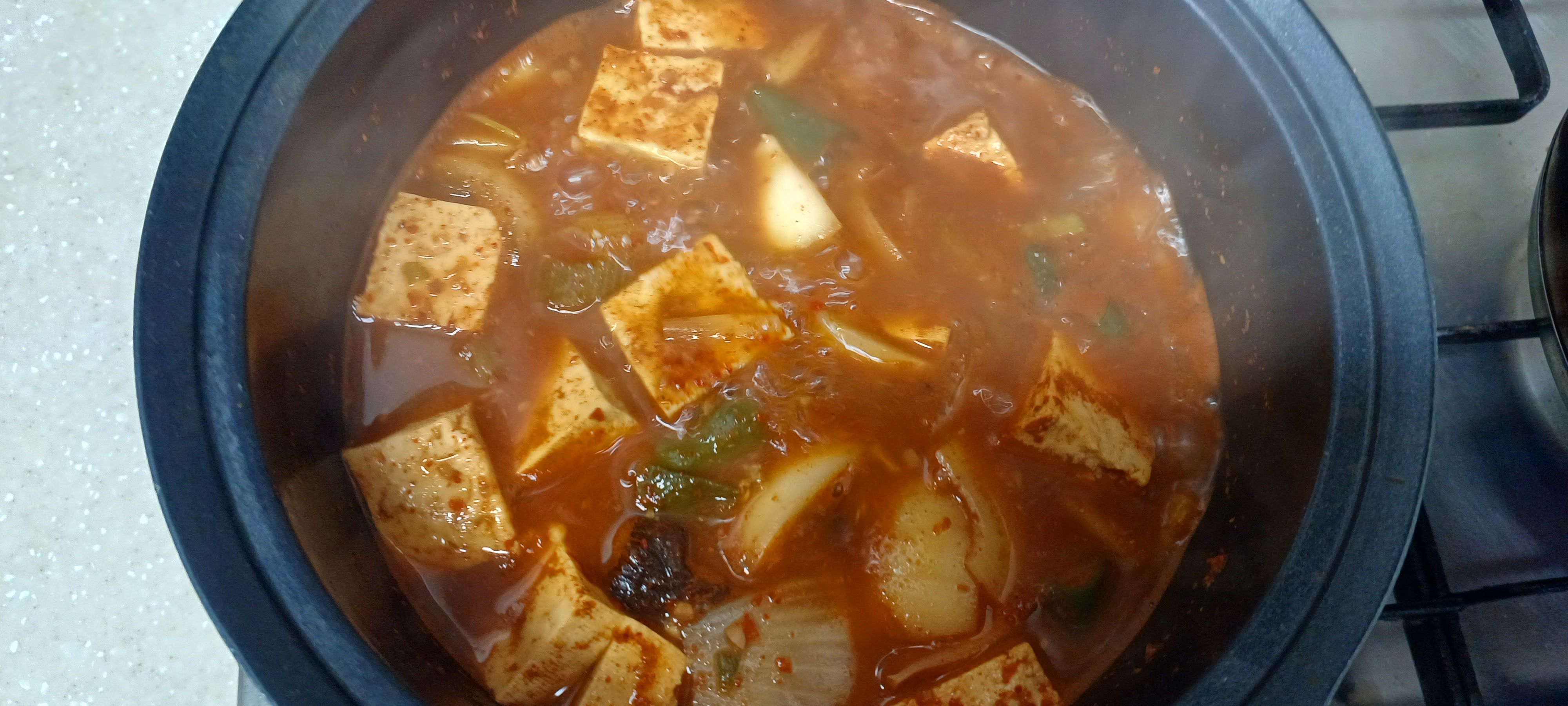 두부에는 양념이 스며들고 야채는 살짝만 익힌 얼큰하고 매콤한 맛있는 된장찌개가 완성되었습니다.