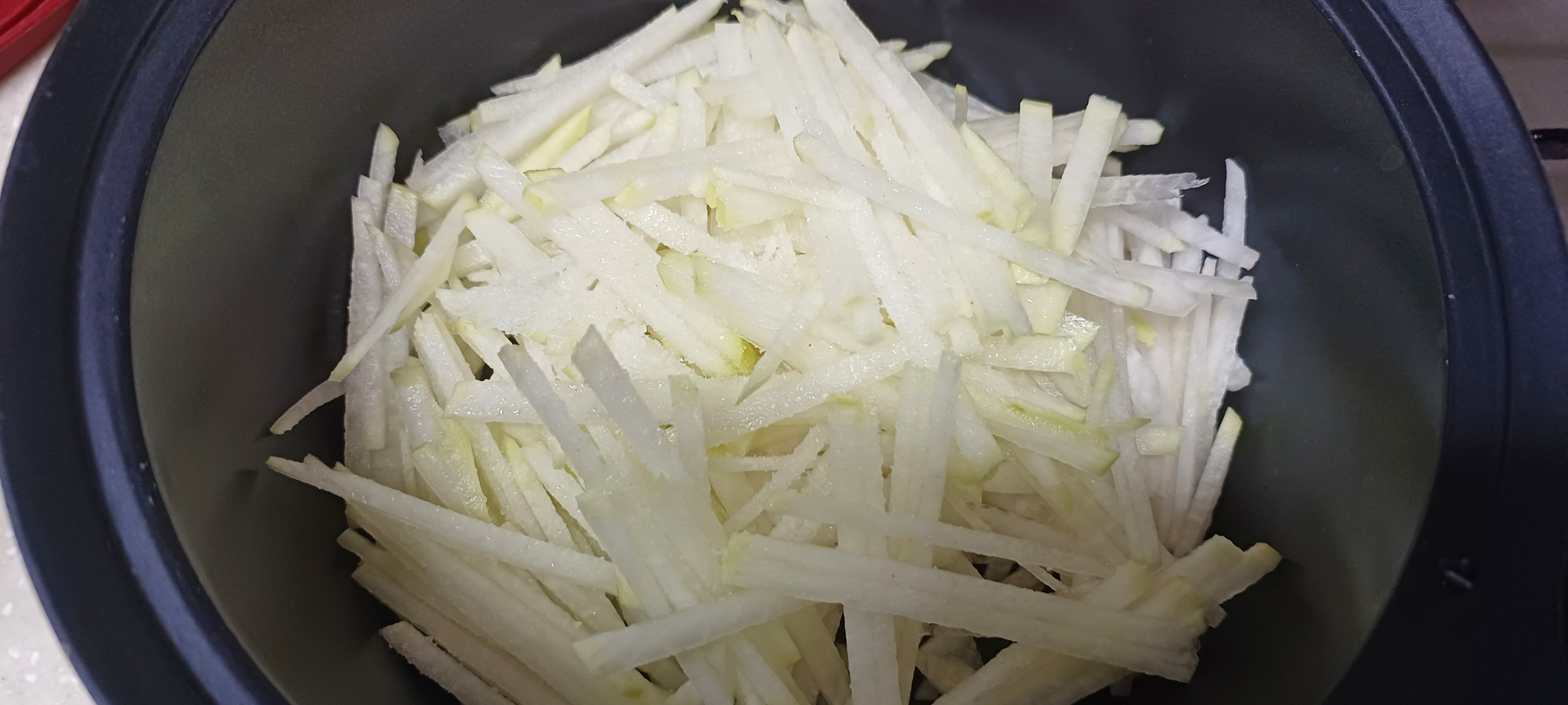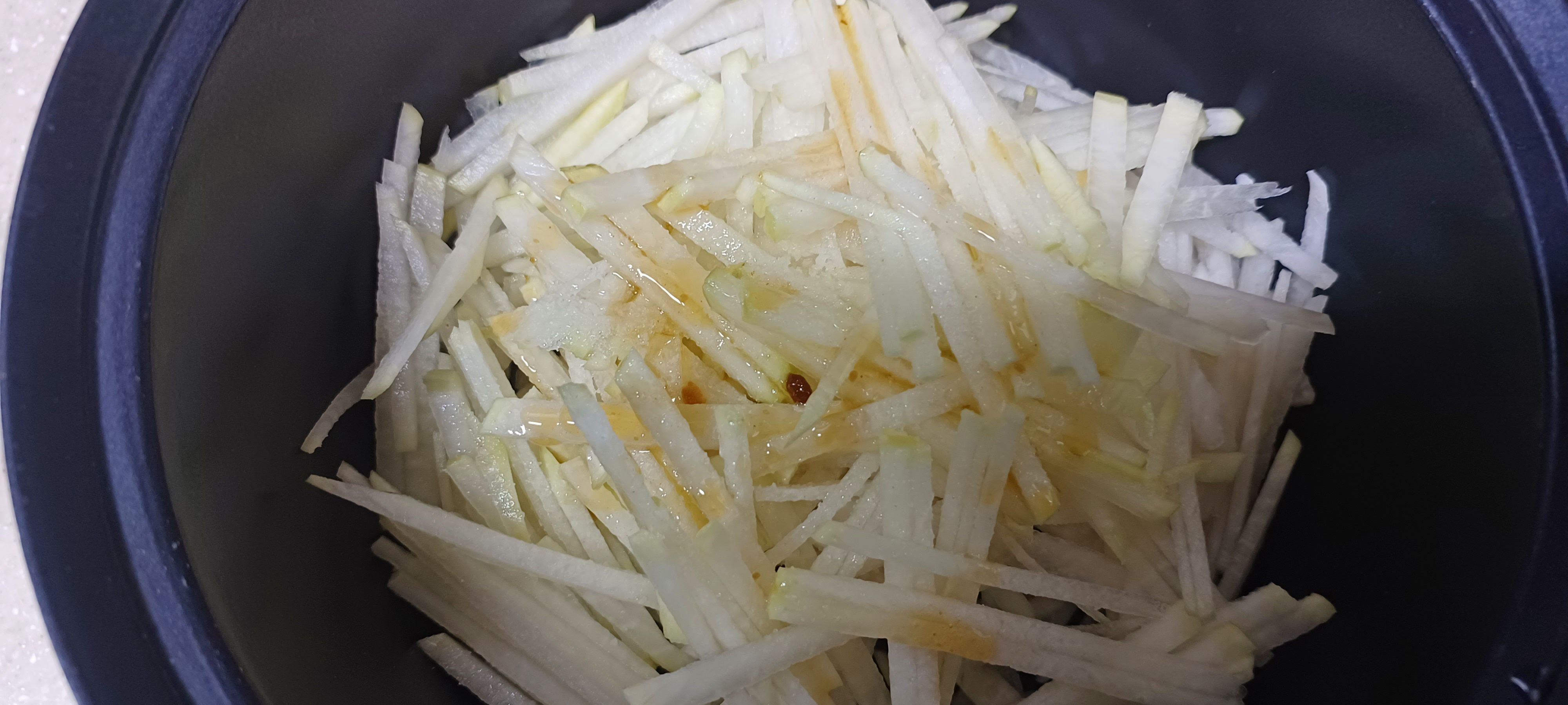 무를 채 썬 다음 소금을 넣고 10분 정도 재워둬 밑간이 배어든 뒤에 요리를 하면 무가 잘 부서지지 않습니다.