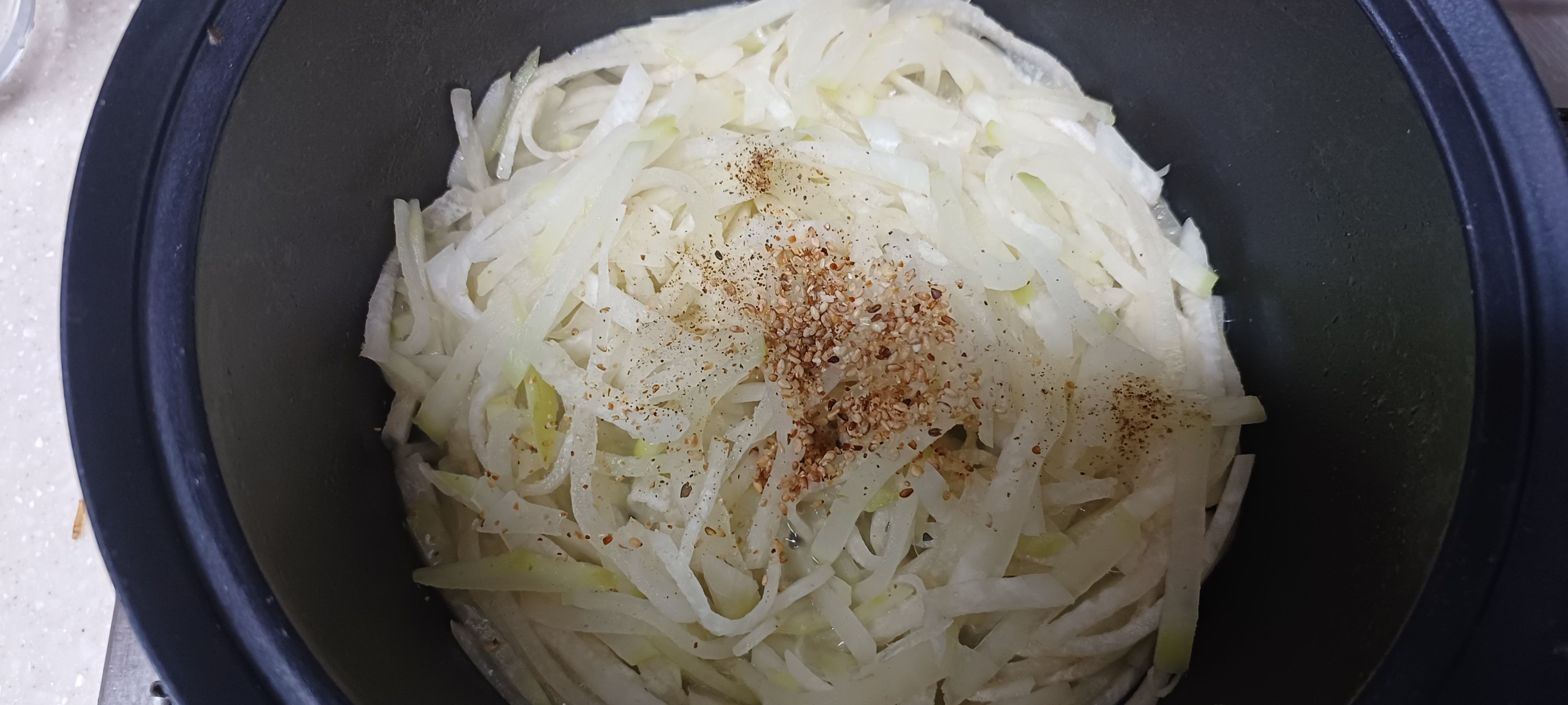 간이 배어들고 무가 어느 정도 숨이 죽을 정도로 볶아 주다가 물을 조금 붓고 뚜껑을 닫아 익혀줍니다.